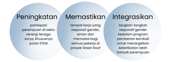 Pertimbangan kesetaraan gender merupakan bagian integral dalam semua aspek pekerjaan kami di Green Roof. Green Roof memiliki Rencana Aksi Gender, yang mengutamakan konteks gender dan tindakan yang diperlukan untuk mendukung kesetaraan gender dalam operasi dan proyek kami. Rencana Aksi Gender mempunyai tiga tujuan utama yang ingin dicapai oleh Green Roof: